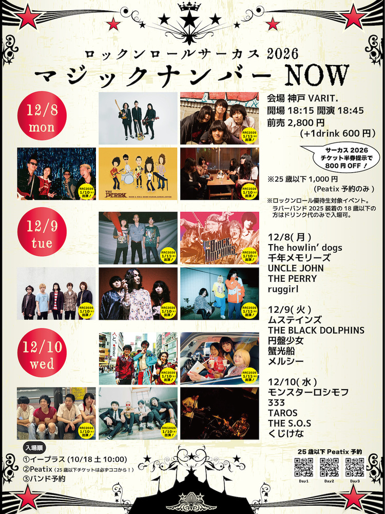 ロックンロールサーカス2026 マジックナンバー NOW Day3 SCHEDULE 2025/12/10(水) 18:15 - 神戸VARIT. "ロックンロールサーカス2026" マジックナンバー NOW Day3 🗓️12月10日(水) 🏟️神戸VARIT. 🎫前売¥2,800/当日¥3,300 🕰️OPEN18:15/START18:45 🎸LIVE 333 TAROS モンスターロシモフ くじけな THE S.O.S e+🎫10/18(土)10:00発売 バンド予約 URLをコピーする 報告する